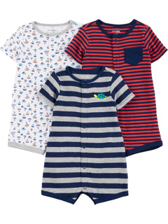 Add a burst of fun and convenience to your baby's wardrobe with this 3-Pack Snap-Up Rompers from Simple Joys by Carter's. Each romper features adorable prints and playful patterns that will keep your little one looking cute and comfy all day long. Designed with full-length snaps, these rompers make dressing and diaper changes a breeze—perfect for busy parents on the go. The short-sleeve, short-leg style is ideal for warmer days, keeping your baby cool and comfortable. Made from soft fabric, these rompers are gentle on delicate skin and easy to clean, ensuring they stay soft wash after wash. With a relaxed fit for active little movers, these rompers are the perfect everyday essential for your growing baby!